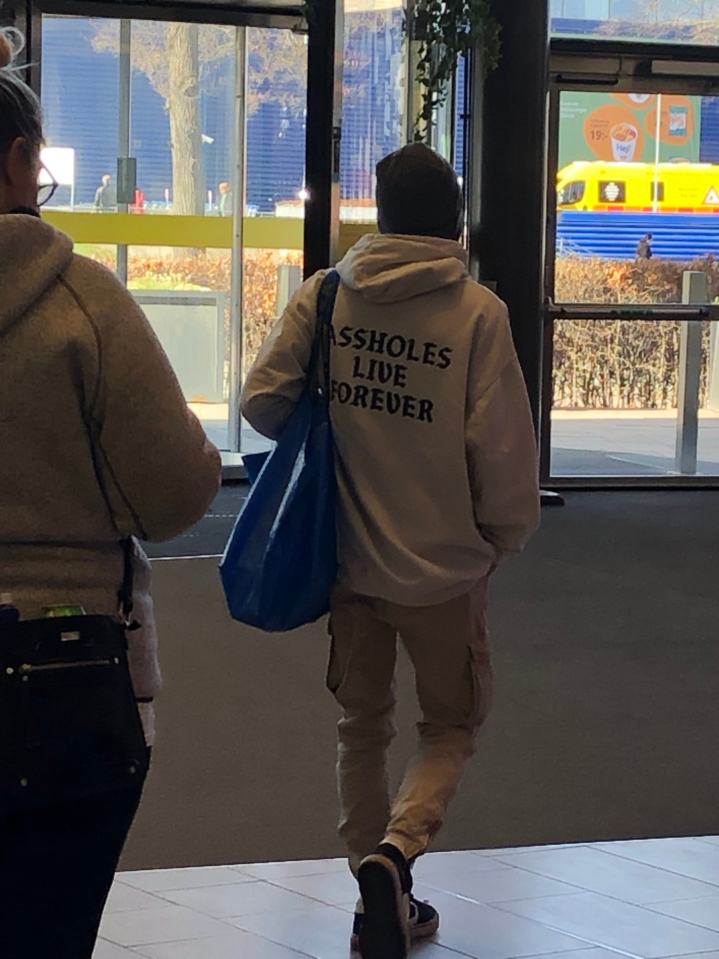 The Minecraft film stars the actor Jack Black, a man whose name rhymes, who shouts (or exaggeratedly whispers) rather than talks, and who has a large chest. The older boy thought that the film was incredibly good, perhaps the best film ever made. Jack Black’s co-star, Jason Momoa, also shouts and has a large chest, but his name doesn’t rhyme. After the film, almost every member of the audience left their popcorn containers, drink mugs and sweet wrappers and bags on the floor next to where they had been sitting. Other people will clean it all up. Out of the cinema and in the main part of the shopping centre there was a man whose sweater (a ‘hoody’, or ‘hooded sweater’) bore the message ‘ASSHOLES LIVE FOREVER’.