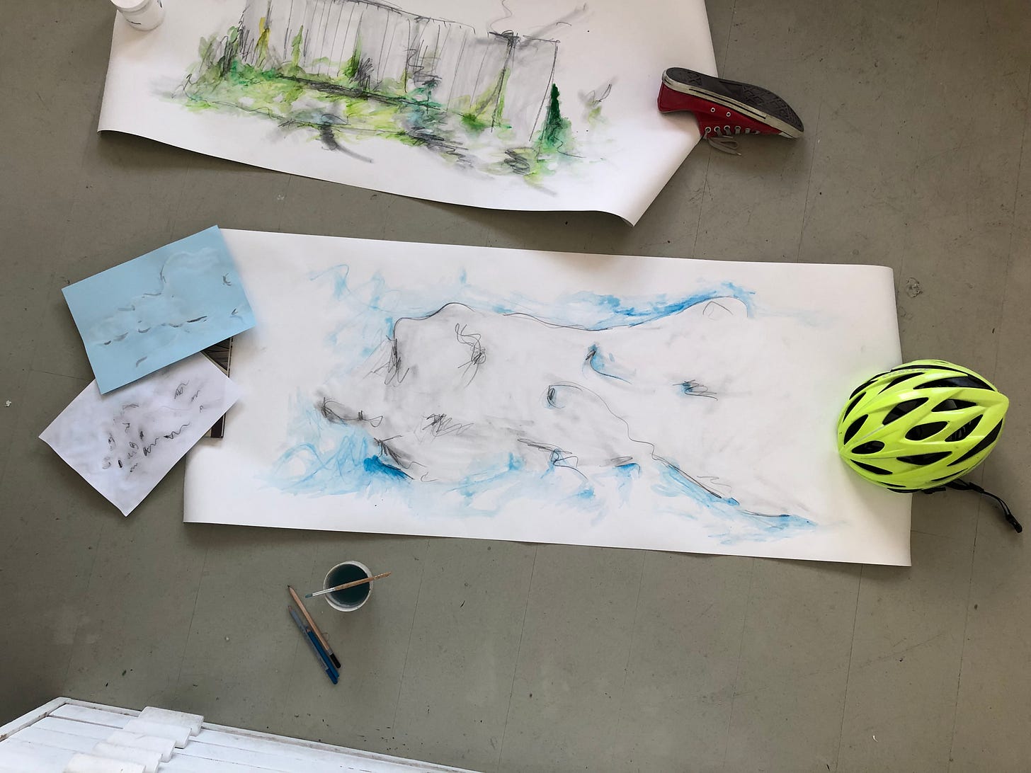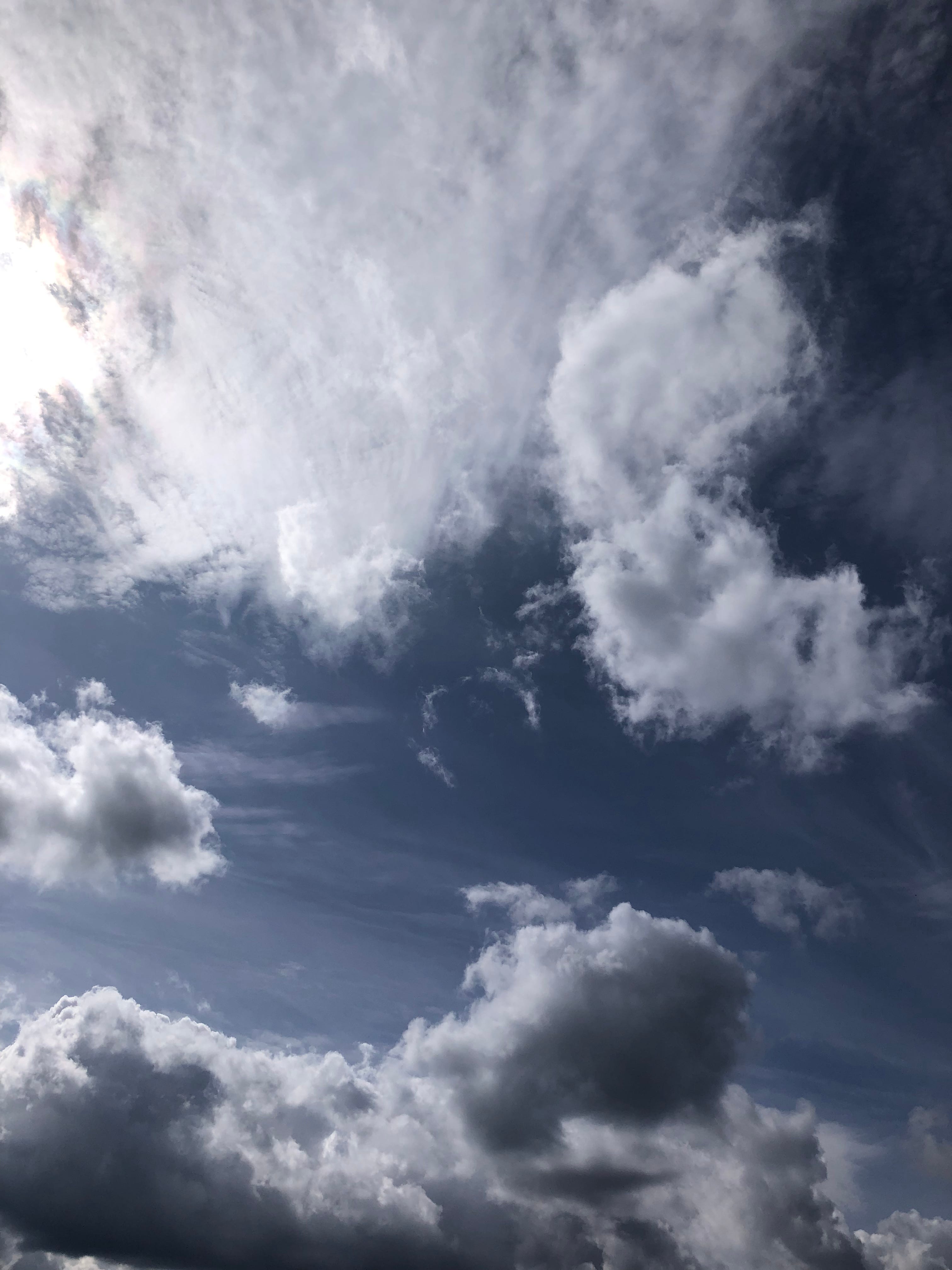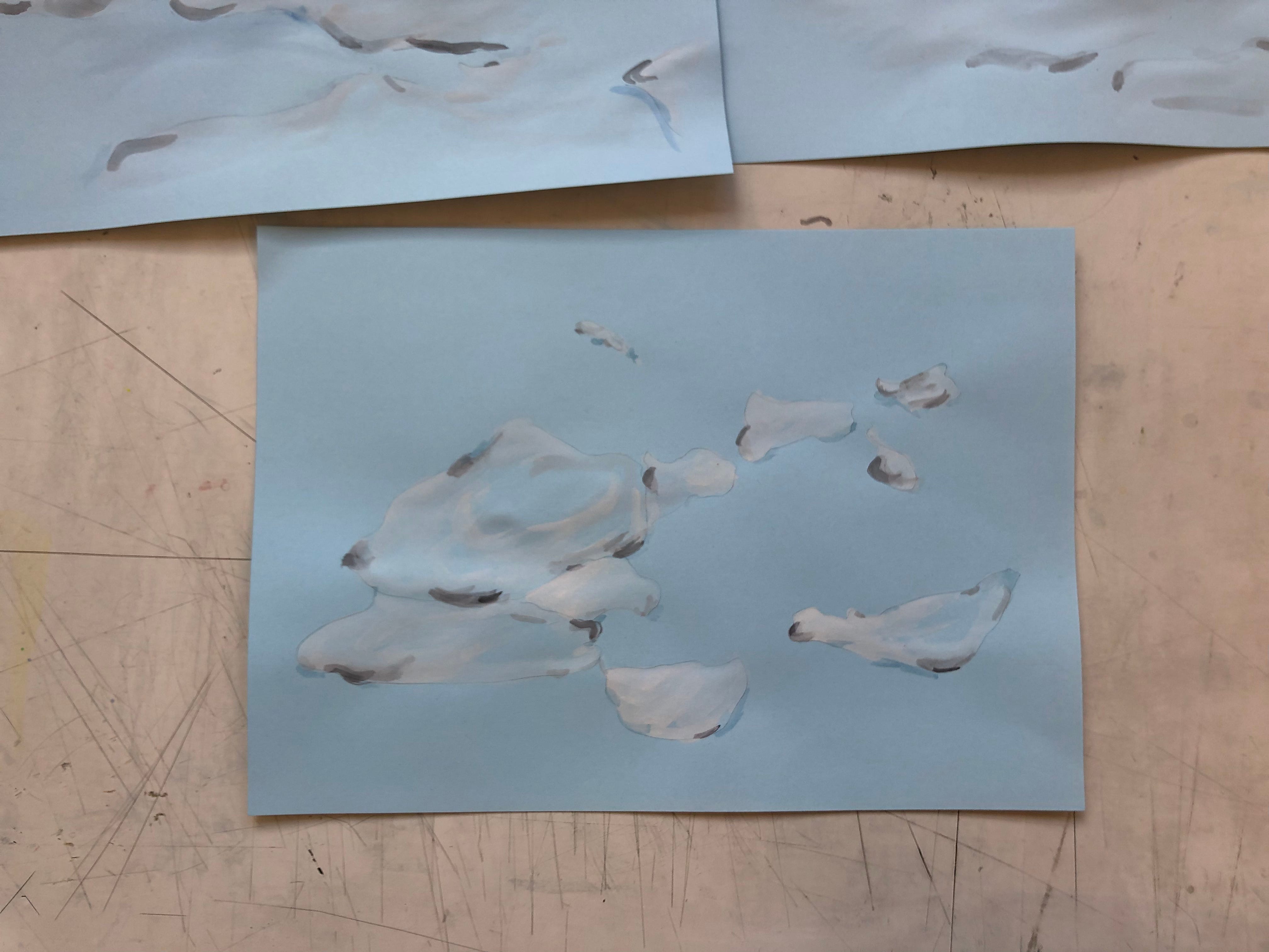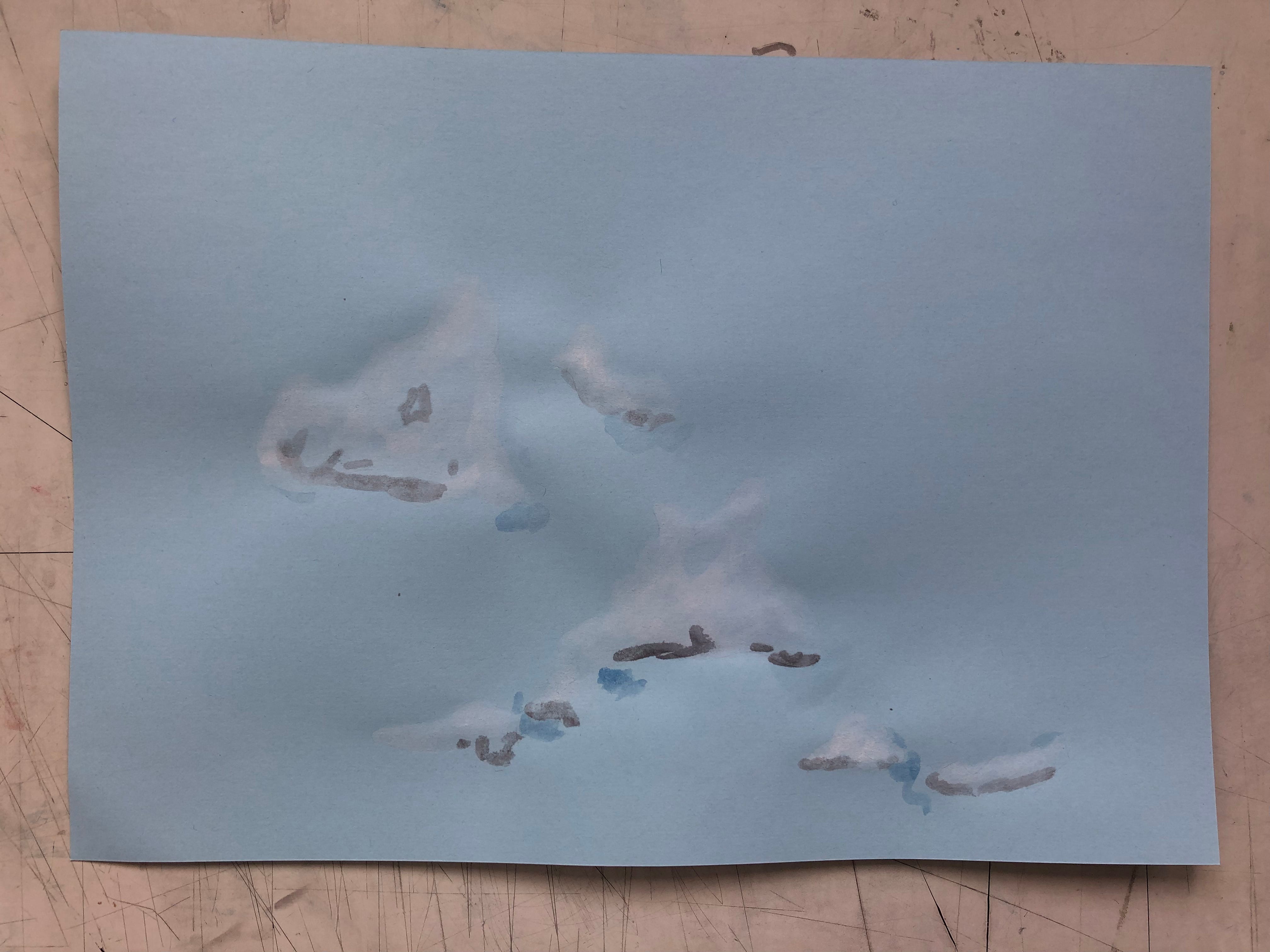It’s very difficult for me to ask for things, especially ‘major’ structural or institutional things like funding. Such requests imply a planned and deserved future. Such plans require planning. I’m not completely inept when carrying out tasks themselves, but it’s hard for me to know what my tasks will be. I just react to small things, and react in small ways. I’ve been making pictures of clouds because they are there, briefly, and because my friend - the Belgian writer - likes clouds. It pleases him to receive images of clouds from me, and it pleases me to receive images of clouds from him. I haven’t intervened upon the clouds. My meteorological skills are not at a level that would allow me to apply for funding to paint specific clouds in advance of them passing, nor to report on the precise nature of the clouds if applying for funding in retrospect. I tend to just see clouds when they are there, sometimes. And then I had some sheets of blue paper at the studio, so I began drawing and painting the clouds on those - that way the ‘sky’ would already be there and I wouldn’t have to paint it.