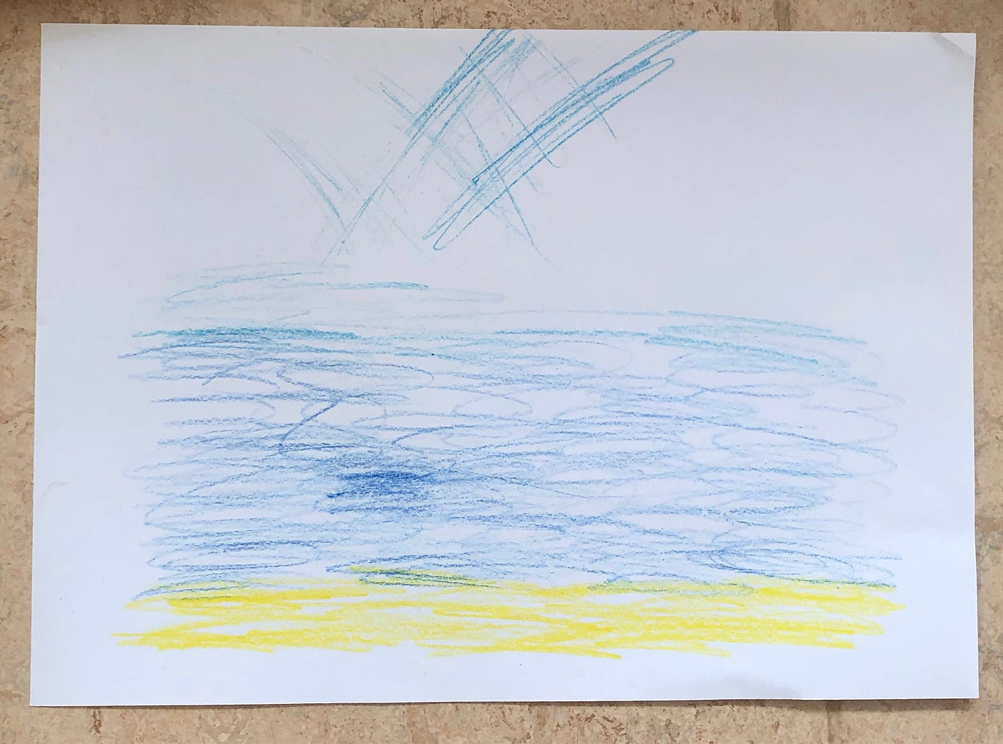 Nonetheless, people go on holiday to beaches. I drew a beach and the sea, and my younger son added ‘the rain’.