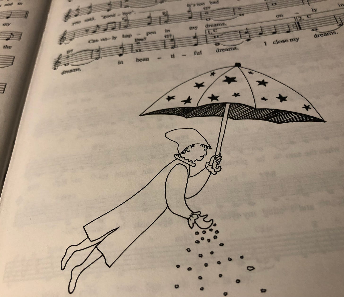 In the room where people leave things they don’t want any more my wife found a book of sheet music for songs that were in the Swedish charts during 1989. These include terrible pop and quasi-schlager songs in Swedish, rereleased classics that must have charted due to their inclusion in film soundtracks, international hits, and several Beatles songs. Each song is accompanied by naive or gently surreal illustrations. Since she brought the book home this selection of songs has formed my entire musical culture. During the odd moments I sit with the guitar I play certain of the songs over and over again, but in the wrong styles and tempos: ‘In Dreams’ by Roy Orbison as if it were one of the catchier Pavement songs, ‘Killing Me Softly’ by Roberta Flack as if it were one of Scott Walker’s Jacques Brel covers, ‘Helpless’ by Neil Young as if it were a John Dowland composition, or ‘Eternal Flame’ by the Bangles as if it were somnolent 90s trip-hop.