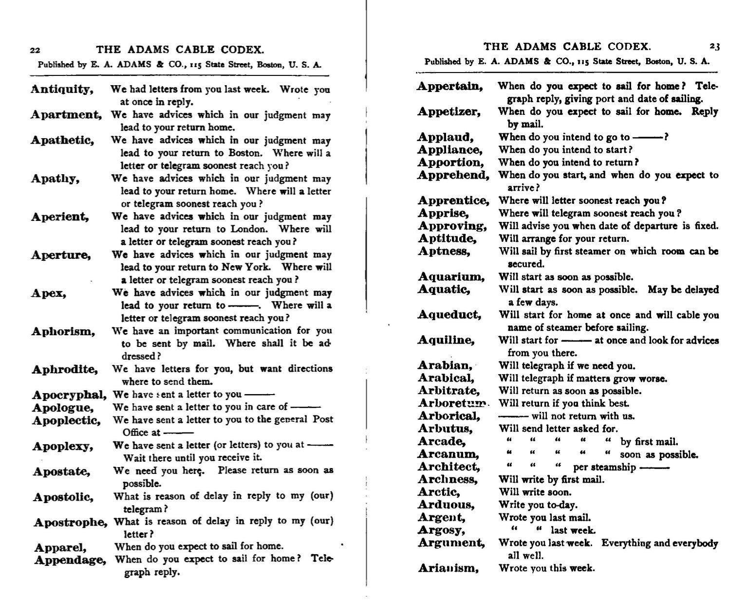 Things are coming apart, but they are being joined together in their fragmentation by the Belgian writer: he keeps writing texts where brusque sentences are joined as if by mortar(s) with the word STOP, like the violent punctuation of a telegram. STOP. He texts me to say that he needs to stop. All the bad news is unstoppable. We spent the summer sending each other pretty pictures, and now that it is term-time we send each other words of horror. STOP. But our friendship remains the same. STOP. The Adams Cable Codex from 1894 is a vast list of code words to abbreviate sentences or sentiments when writing telegrams. The code words are existing English words, usefully unrelated to the meanings they encode. ‘Closeness’ means ‘circumstances over which I (we) have no control’. STOP. ‘Iridescent’ means ‘what have you done? Write reply’. STOP. ‘Maritime’ means ‘looks like easy money’. STOP. ‘Martyr’ means ‘market affected by scarcity of money’. STOP. ‘Reparation’ means ‘have just learned the sad news’.