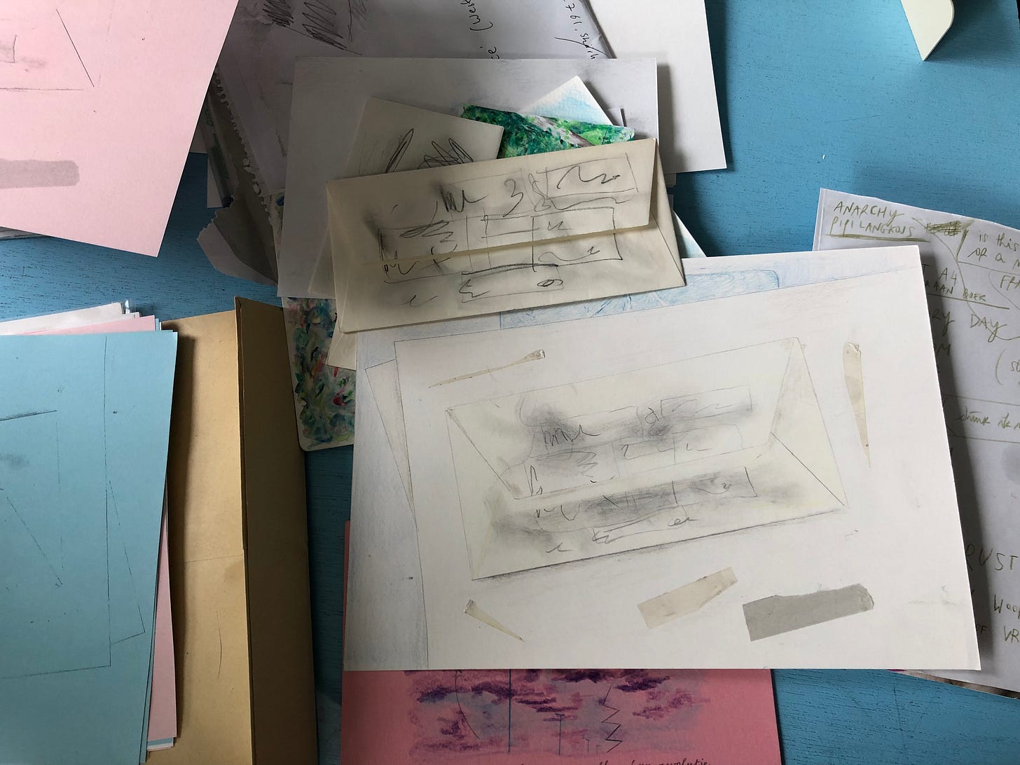 As well as drawing clouds I keep drawing ‘spaces’, generic spaces. Public ‘spaces’, private ‘spaces’, ‘art spaces’, ‘political spaces’, ‘empty spaces’. I also photograph these, and send both the photographs and the original drawings to the Belgian writer.